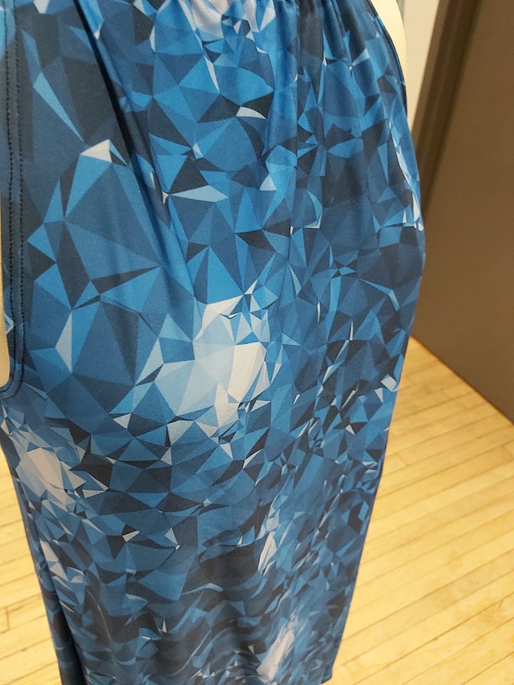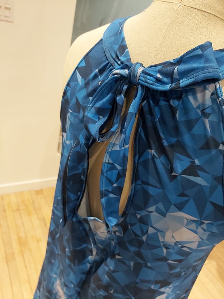 Robe longue réalisée dans le motif Texture Géo – Bleu Cristal, imprimé sur le tissu Butterknit Tricot Jersey. Ce textile se distingue par sa maille souple, son toucher soyeux et son drapé fluide, procurant confort et aisance au porter.