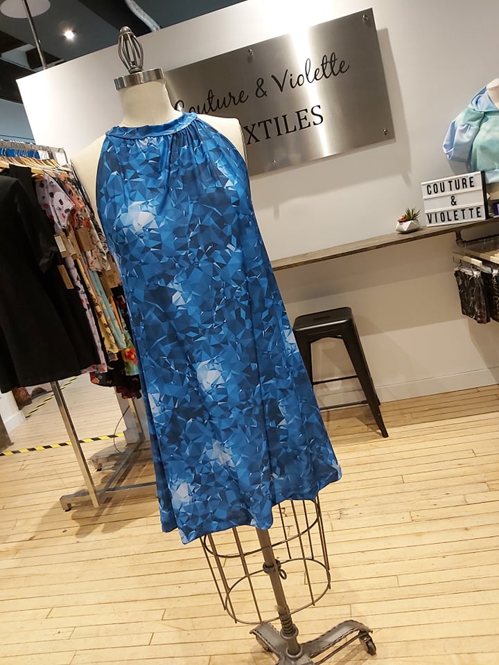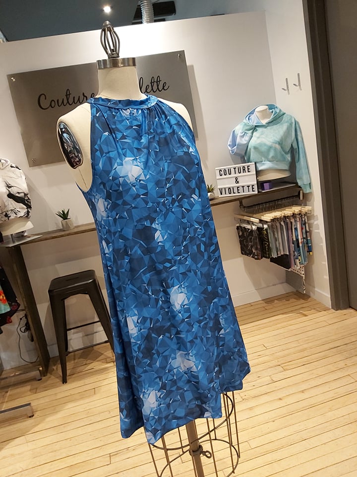 Robe longue réalisée dans le motif Texture Géo – Bleu Cristal, imprimé sur le tissu Butterknit Tricot Jersey. Ce textile se distingue par sa maille souple, son toucher soyeux et son drapé fluide, procurant confort et aisance au porter.